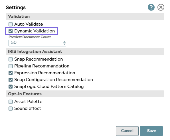 Dynamic validation validates Snap properties as you enter them. SnapLogic starts