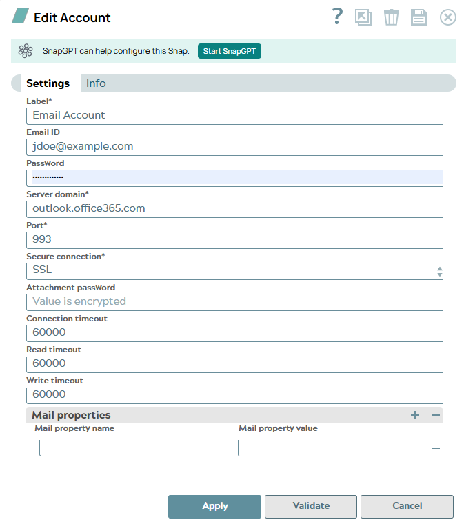| Port | Integer | Required. Specify the port number of the email server. This will vary depending on your mail provider and the Secure connection selected. The default port for IMAP is 993. Default value: None. Example: 993 |