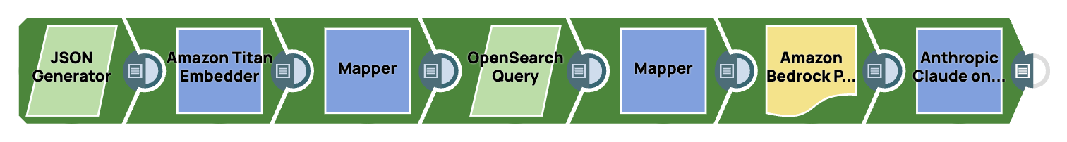 - Retriever: Retrieves data to answer questions. This pipeline connects to an LLM endpoint using Amazon Bedrock Snaps. It takes in a question, generates embeddings using the Titan Embedder Snap, queries similar embeddings in OpenSearch Query Snap, constructs a context for the Amazon Bedrock Prompt Generator, and passes it to the Anthropic Claude on AWS Messages Snap to generate a response.