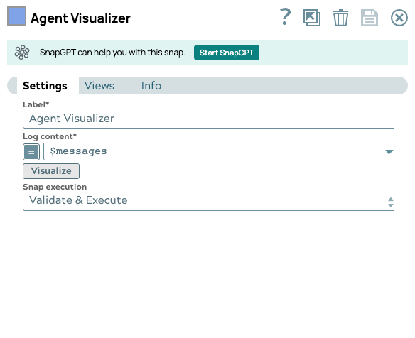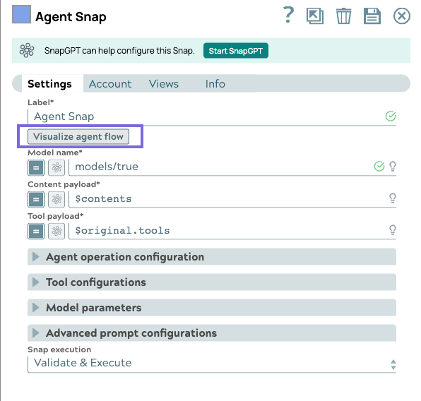 Starting with the November 2025 release, you can launch the Agent Visualizer UI from the Agent Snap. The Agent Snap consolidates the capabilities of chat completions and tool calling Snaps and combines these with the agent execution loop feature in the Pipe Loop Snap. Each LLM Snap Pack has an Agent Snap, which accepts input containing an initial request contents, a list of tools, and parameters to invoke an agent execution loop.