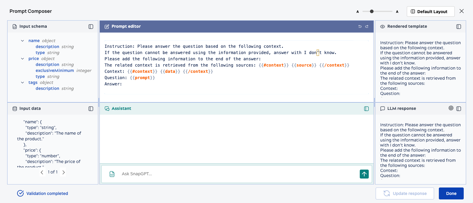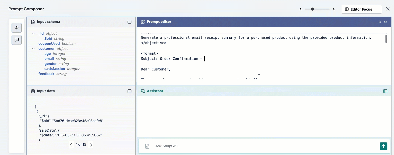 Empowers you to write and modify prompts by leveraging SnapGPT for help. This also removes the need to use mustache template syntax. You can ask the SnapGPT to generate your prompt using natural language. When SnapGPT returns a suggested prompt, it displays in the Prompt Editor window. Learn More.