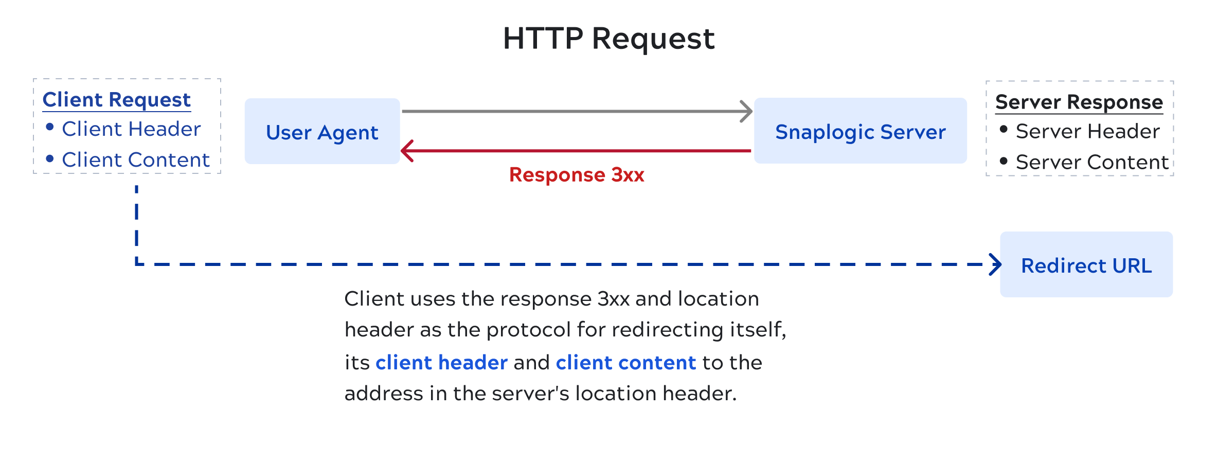 In this context, the client side is called the user-agent. For APIM, the user-agent might be a web browser, HTTP client, or cURL application. Since the user-agent is responsible for handling the response, the rule assumes that the user-agent (and not the server) performs the redirects; this includes processing follow-on HTTP methods, payload content, and redirect addresses. The server (Snaplex) is only responsible for setting the Response status type, status code, location header, and, where defined, the message content.
