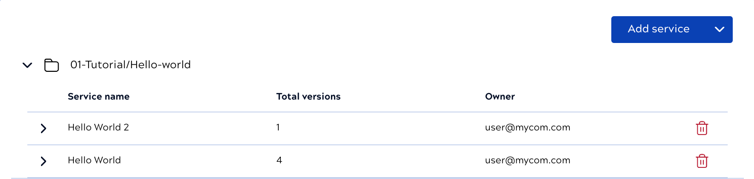 - From the Services catalog, expand the Service and click the trash can next to the version to delete:
