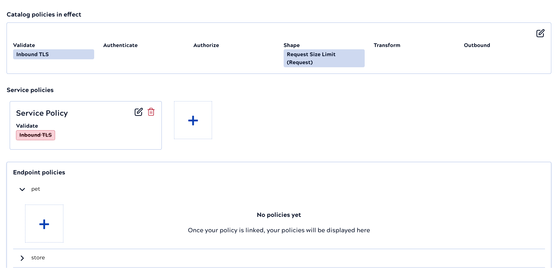 A Policy is a collection of rules that apply to specific Services or endpoints. A Catalog Policy applies to all Services unless overridden at the Service or endpoint level. You can create one Catalog Policy. Each rule in the Catalog Policy has a checkbox that determines whether the Catalog rule overrides Service and endpont rules. With the Always use Catalog rule box: