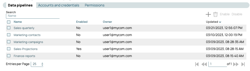 - The Data pipelines tab lists AutoSync data pipelines created by the user.