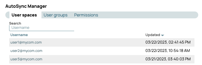 As an Org admin, when you add a user to AutoSync, the SnapLogic Platform creates a space where the system stores their data pipelines, credentials, and Accounts. Select AutoSync Manager from the left navigation pane to view AutoSync User spaces: