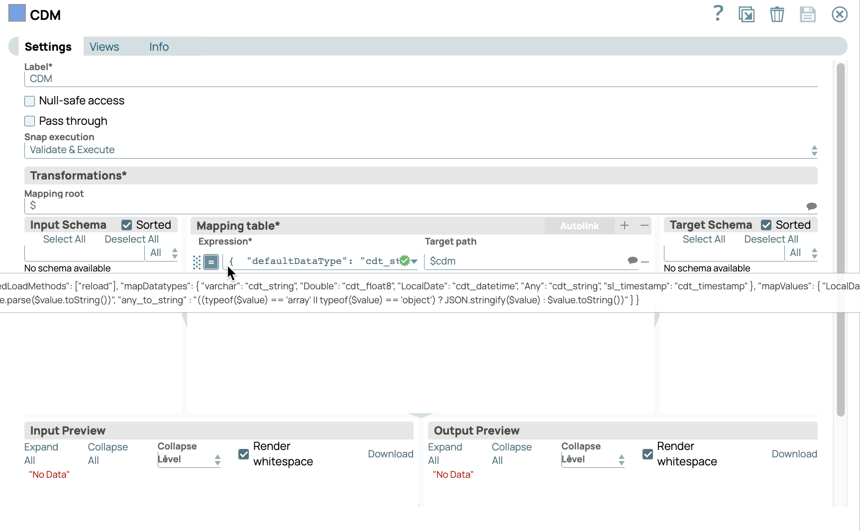 The definition pipeline contains the transformation and mapping of endpoint data types to or from the common data model. In the SimpleGoogleSheeets and SimpleSnowflake endpoint examples, you can find the following the following transformation and mapping expressions in the CDM Snap. Hover over the expression to expand it for visibility: