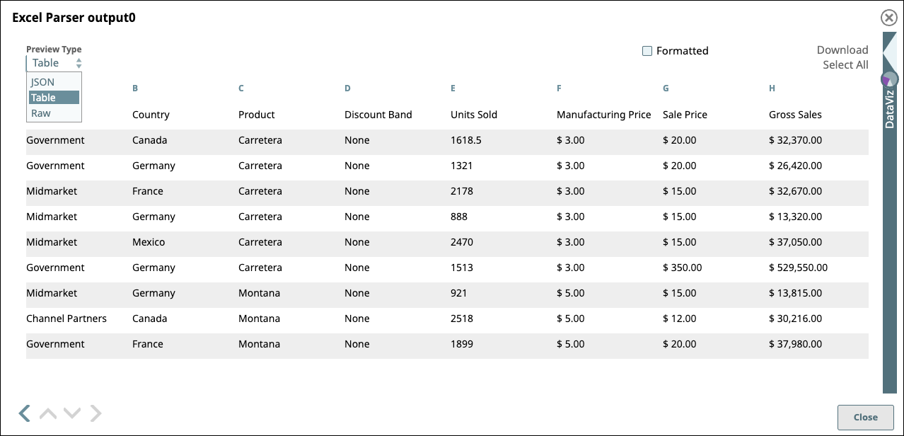 By default, the data preview displays as a table. The Data Preview for some Snaps, such as file readers, displays the metadata instead of data values. The following example shows preview data values after passing through an Excel Parser Snap: