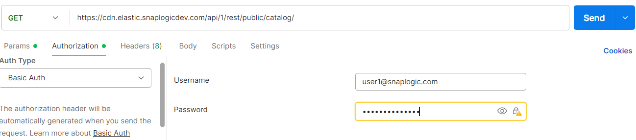 In the request header, specify Basic for authorization, add your credentials (Login and password of your SnapLogic user or service account), and specify application/json for content type.