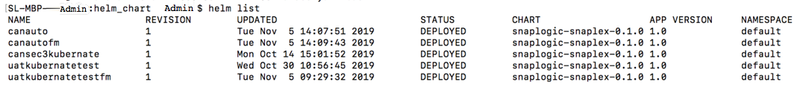 $ helm install snaplogic helm_chart_folderwhere helm_chart_folder is the Helm Chart ZIP file, which you can download from this document. - Run the Helm list command to determine the status of the deployment. The following