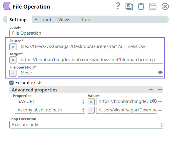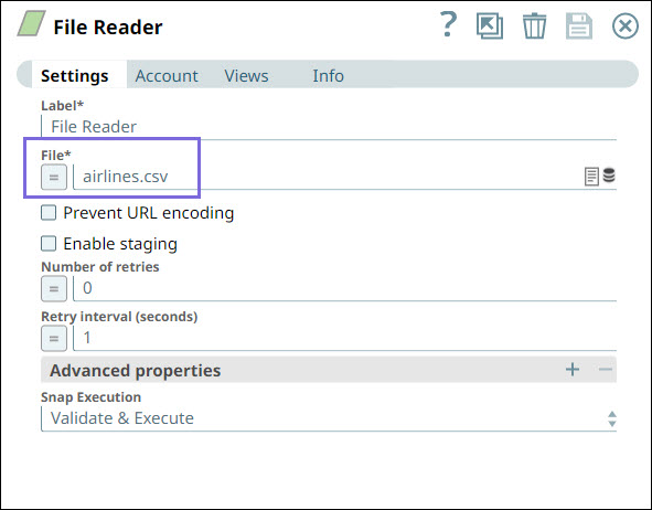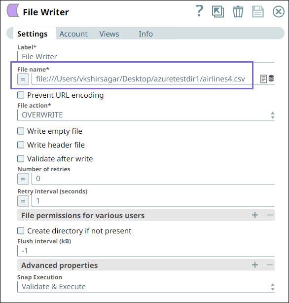 Next, we configure the File Writer Snap to write the airlines.csv file.