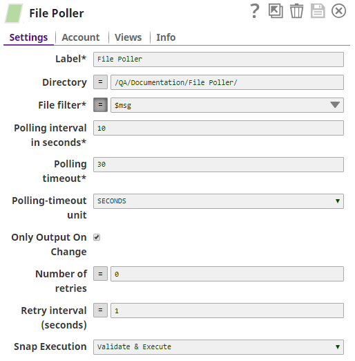 - File Poller : Polls a specific directory for files matching the pattern specified in the parameter received from the Mapper Snap.