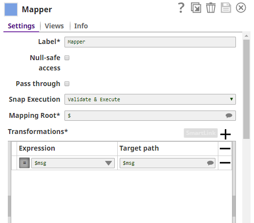 Mapper: Configure the Mapper Snap to receive the parsed CSV data and map the message in the CSV document to the $msg variable: