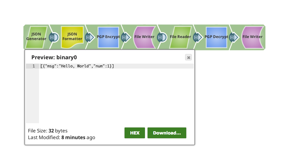 We will start with a JSON Generator Snap which has a sample message "Hello World", which is formatted and written as JSON binary data for the PGP Encrypt Snap to ingest.