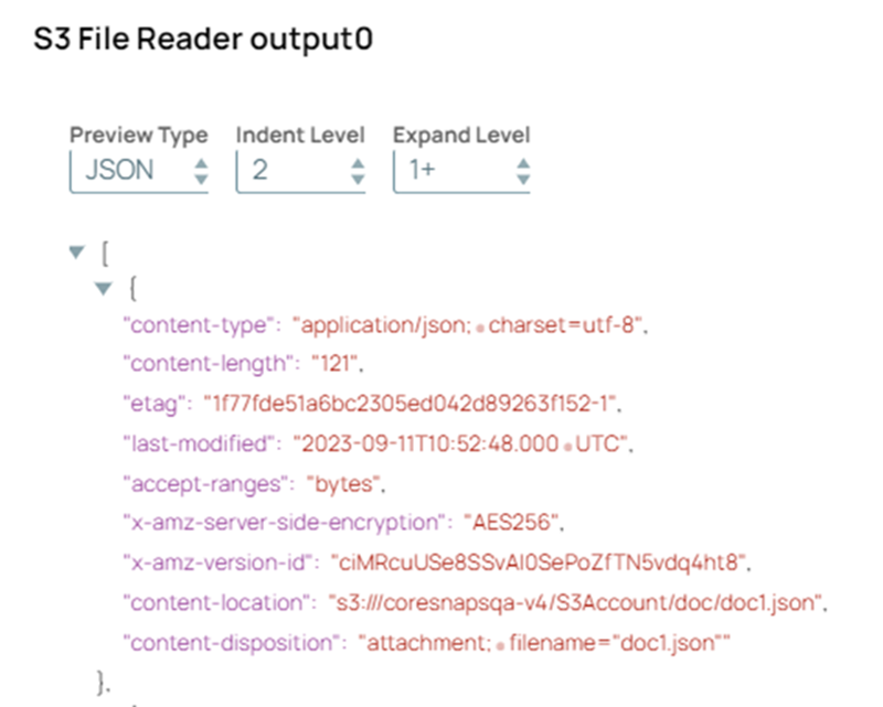 You can view the document data in the S3 File Reader Output.