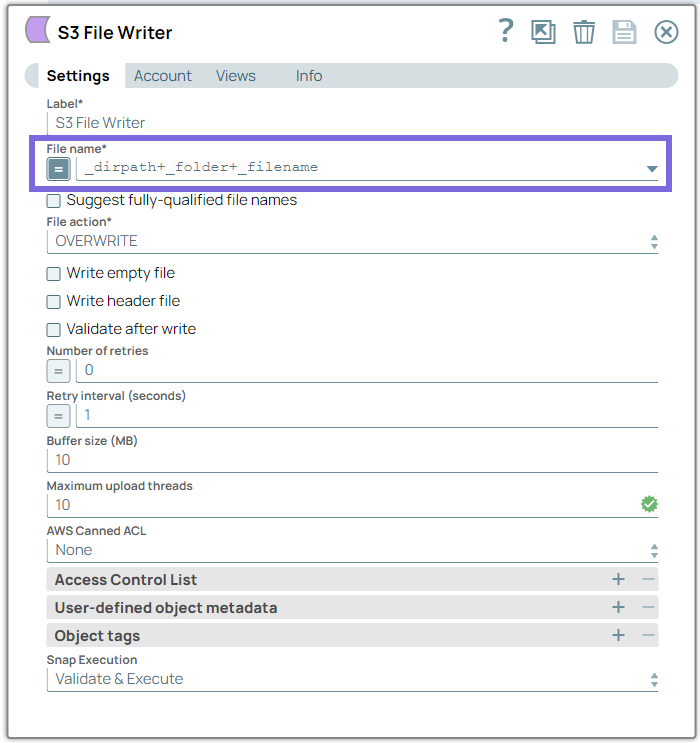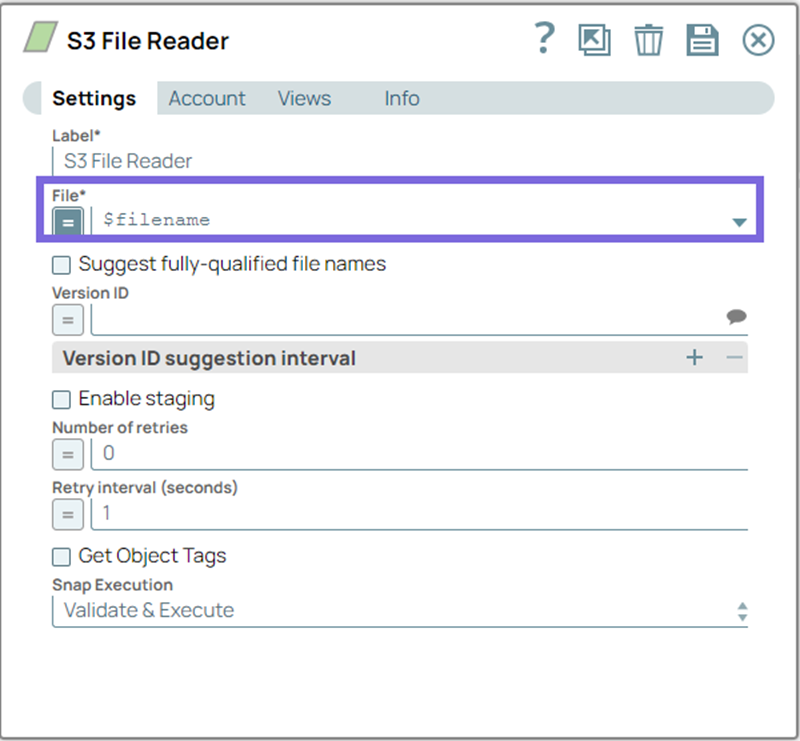 5. Configure the S3 File Reader Snap to read the specific object data from the S3 bucket.