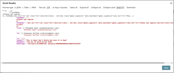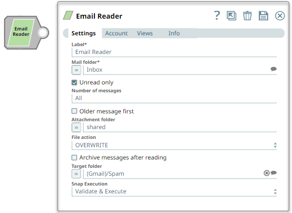 The emails read by the Snap can be archived/moved to a specified target location using this Snap. In this example, the emails are moved to the Spam folder. The pipeline is as shown in the screenshot below: