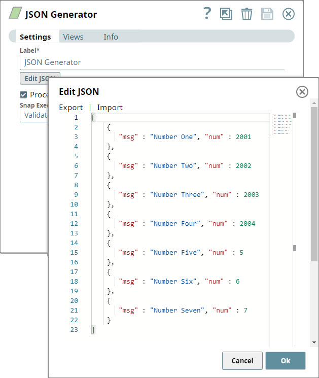 1. Add a JSON Generator Snap to the Pipeline and configure it send seven documents, in three of which the $num field contains even numbers. In the four remaining documents, $num contains odd numbers.