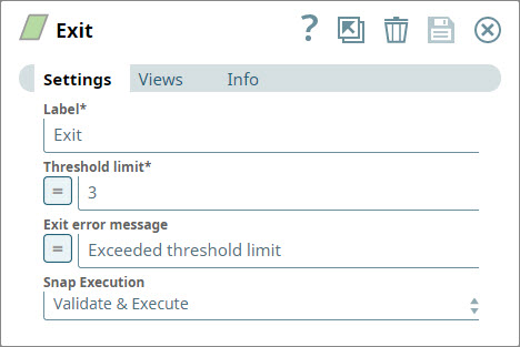 2. Add an Exit Snap to each output view of the Router Snap and configure them both to pass three documents and throw an error when they receive more than three documents. Also, add an output view to each Exit Snap, so you can view the documents that were passed.