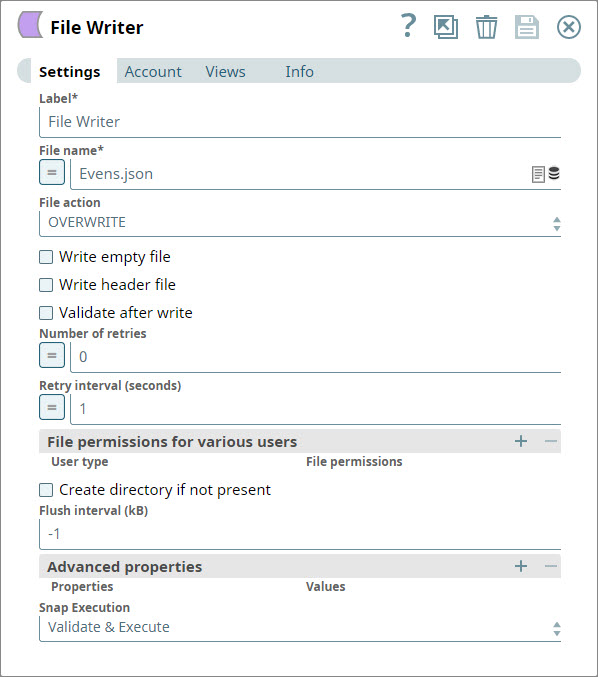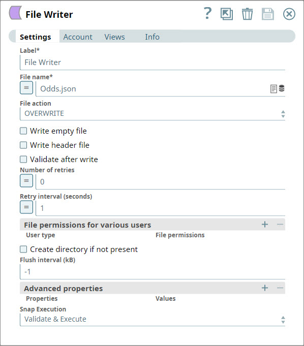 4. Add a File Writer Snap to the output view of each JSON Formatter Snap and configure each to write out the data received as JSON files in SLDB.