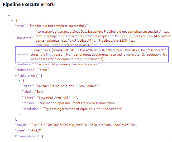 4. The Exit Snap attached to the Odd branch offers all three documents as output. It also sends an error back to the PipeLine Execute Snap, which triggered the child Pipeline.