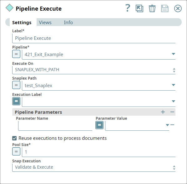 2. Add a PipeLine Execute Snap to the Pipeline and configure it to execute the child Pipeline once for the entire collection of documents received from the JSON Generator Snap. To do so, select the Reuse executions to process documents check box. If you do not select this check box, then the child Pipeline will be executed once for each document coming in, and the Exit Snap will always receive only one document and never throw an error. For details on configuring the PipeLine Execute Snap, see PipeLine Execute .