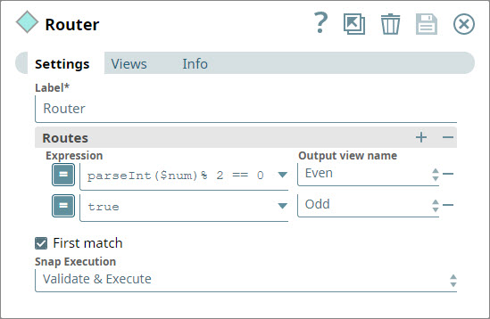 1. Add a Router Snap to the Pipeline and configure it to route all documents containing even numbers in the $num field into a branch labeled Even, and all documents containing odd numbers into a branch labeled Odd.