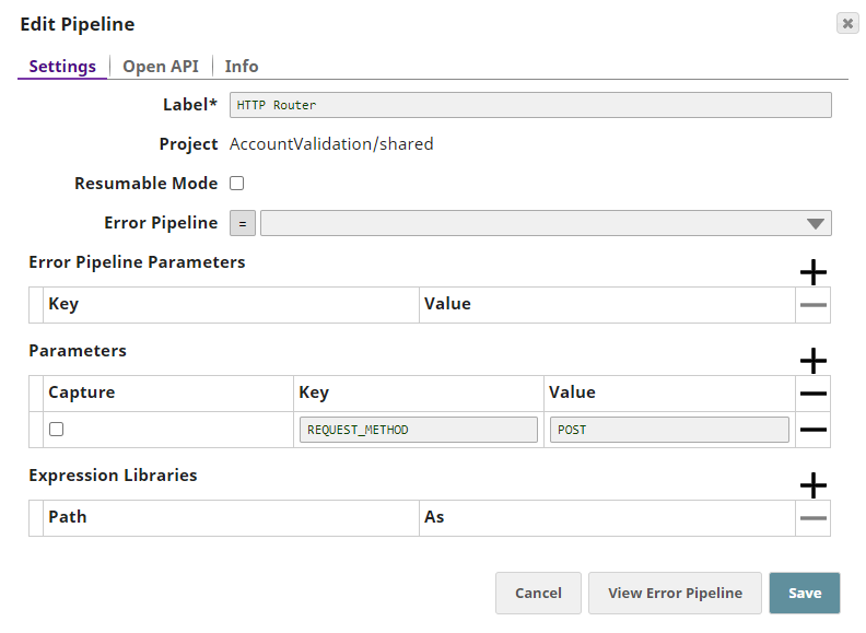 The following example pipeline demonstrates the use of HTTP Router Snap to process an incoming POST request via a Triggered Task. This Pipeline contains the REQUEST_METHOD parameter configured with the value POST.