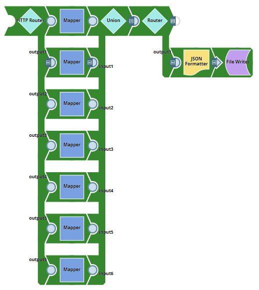 In this example, the HTTP Router uses this JSON document and the REQUEST_METHOD from the Triggered Task as inputs. Based on the incoming value for REQUEST_METHOD (POST in this example), the HTTP Router routes the document to the corresponding output view (output1 in the validated Pipeline above). The Pipeline execution continues further to finally write the formatted JSON output into a JSON file.