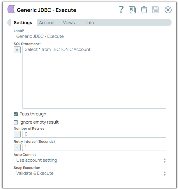 to retrieve all columns from the Account table. On validation, the Snap displays