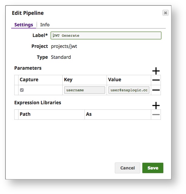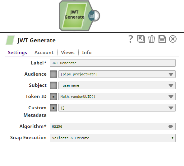 The pipeline below shows a standalone JWT Generate Snap (we define a pipeline parameter called username and there is an associated JWT Account ).