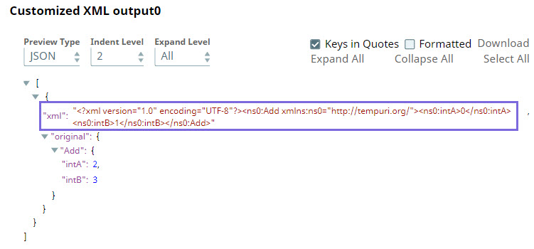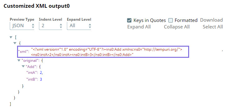 Using two XML Generator Snaps: Customized XML and Generated XML, the Pipeline demonstrates the differing output when custom XML is provided vs when the output is generated using upstream data. Both Snaps are provided the same schema info.