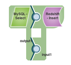 The Redshift Insert and Bulk Load Snaps also support two input views. One view accepts the rows to insert into a table and the other accepts the JDBC metadata dump generated by the second output view of a DB Select Snap. You can do a trivial table replication by creating a pipeline with a Select and a Redshift Insert Snap and connecting the views together, like so: