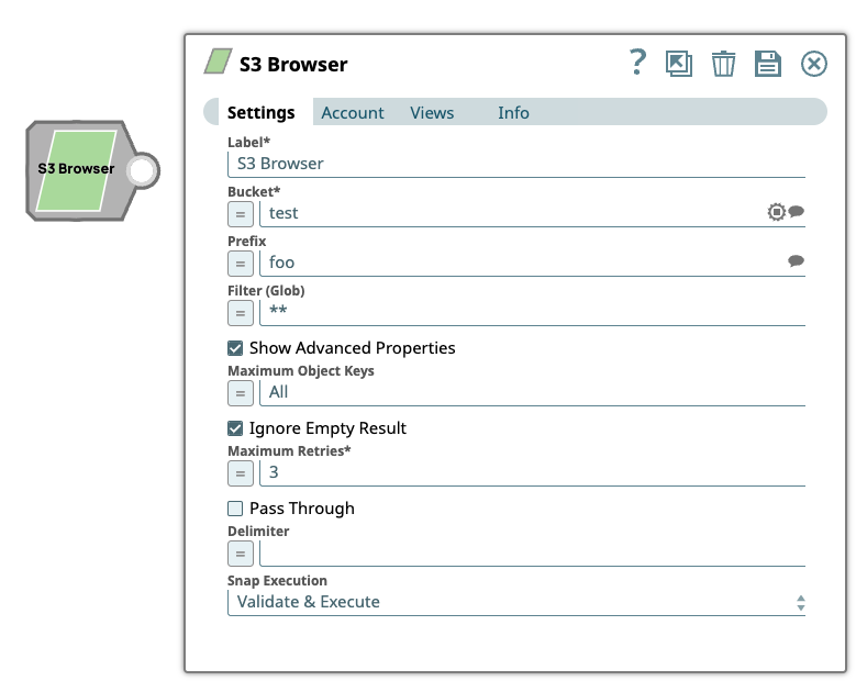 | Label | String | Required. Specify a unique name for the Snap. Modify this to be more appropriate, especially if more than one of the same Snaps is in the pipeline. Default value: S3 Browser Example: Browser IT Resources |