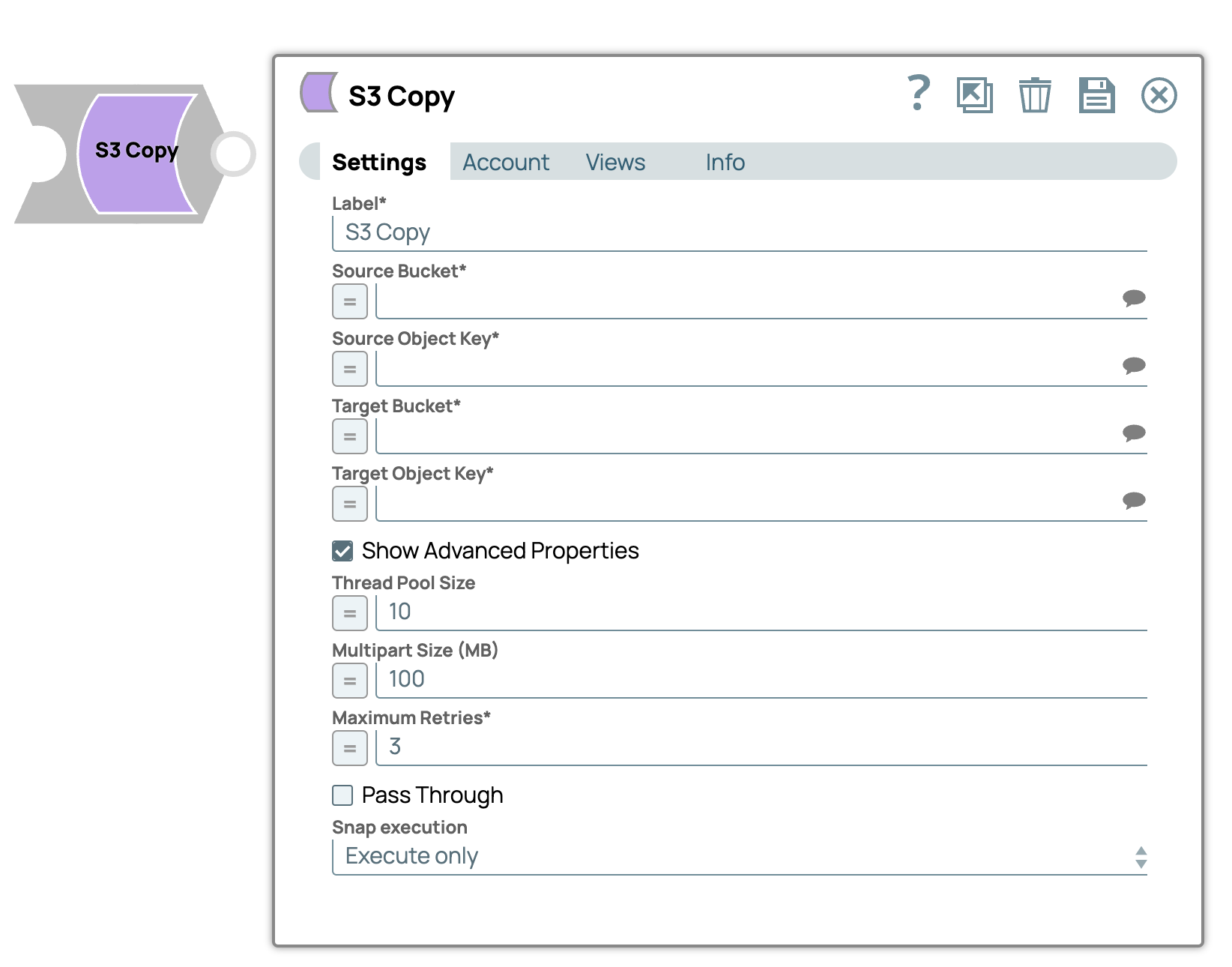 | Label | String | Required. Specify a unique name for the Snap. Modify this to be more appropriate, especially if more than one of the same Snaps is in the pipeline. Default value: S3 Copy Example: S3 Copy |