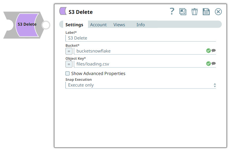 | Label | String | Required. Specify a unique name for the Snap. Modify this to be more appropriate, especially if more than one of the same Snaps is in the pipeline. Default value: S3 Delete Example: Delete Demo Object |