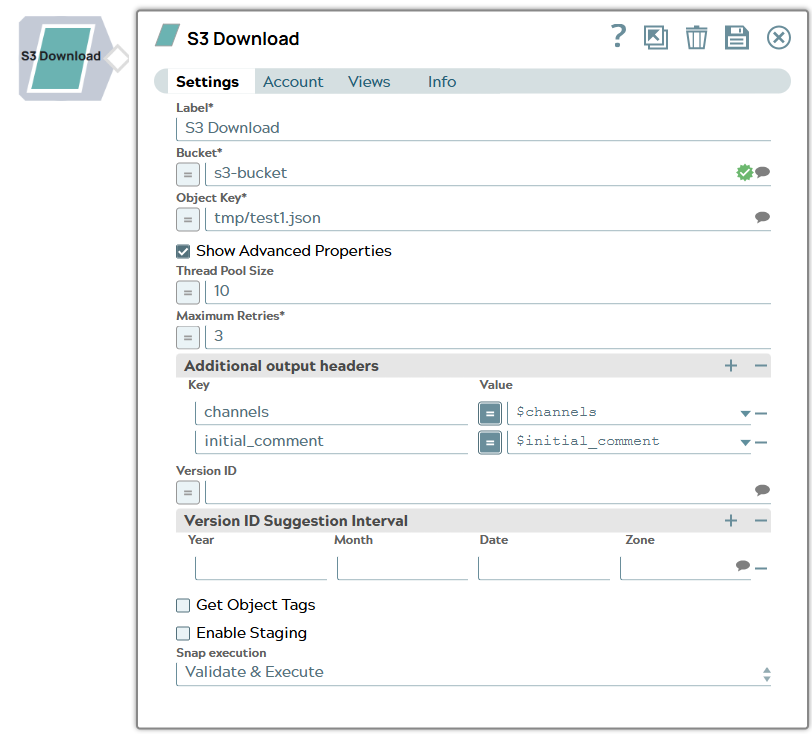 | Label | String | Required. Specify a unique name for the Snap. Modify this to be more appropriate, especially if more than one of the same Snaps is in the pipeline. Default value: S3 Download Example: S3 Download |