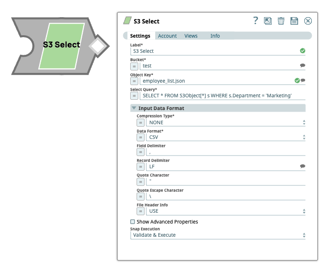 You can use this Snap to execute a SELECT query on CSV, JSON, and Parquet S3 objects, which may be compressed in GZIP or BZIP2 format.