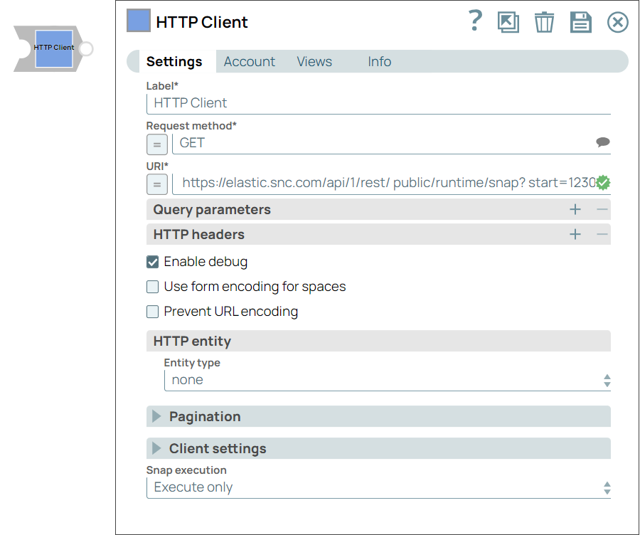 The HTTP Client Snap is an advanced REST Snap that enables you to send HTTP requests to a server and receive corresponding HTTP responses. It integrates all commonly used HTTP methods, including DELETE, GET, HEAD, OPTIONS, PATCH, POST, PUT, and TRACE.