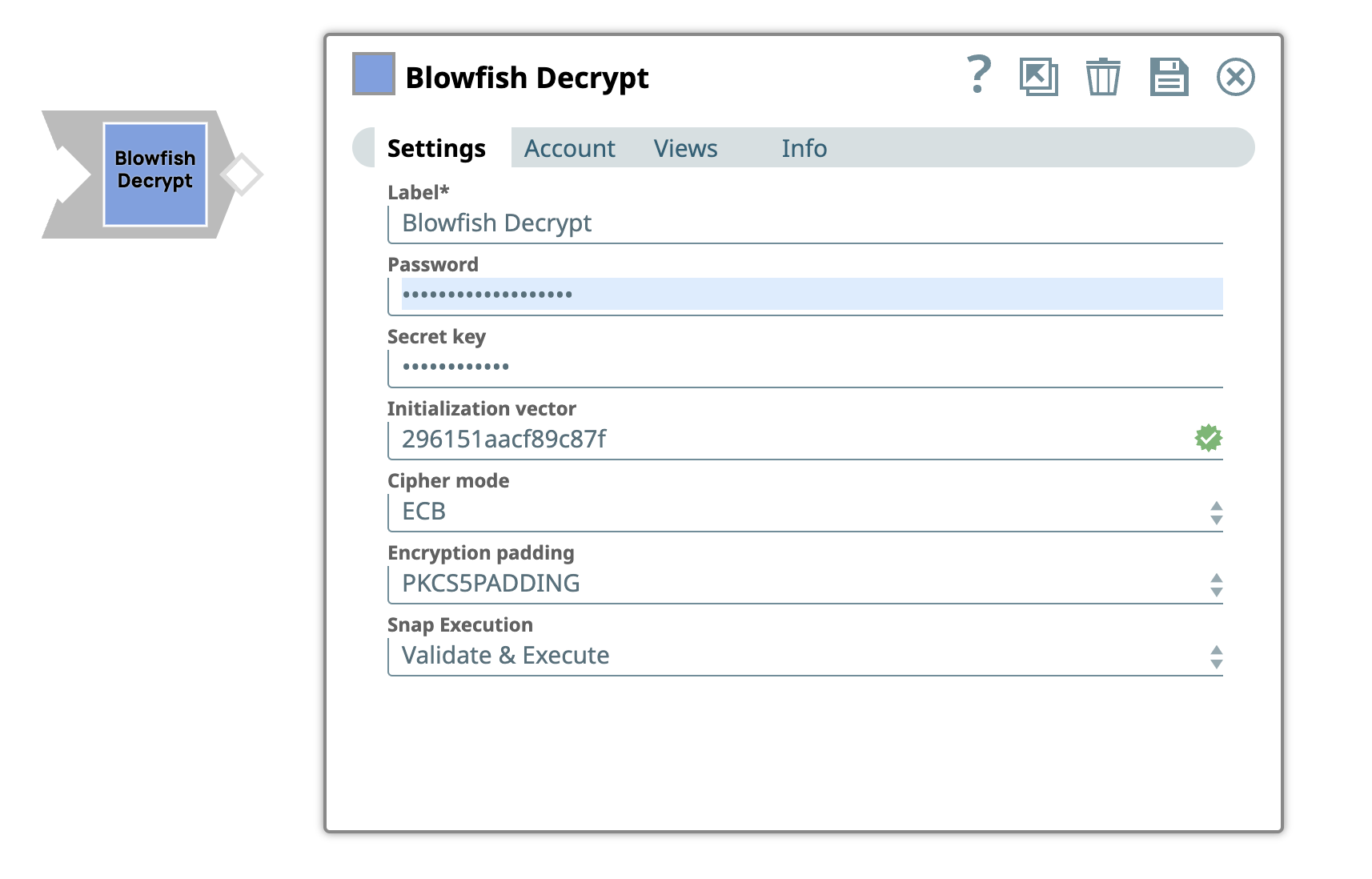 | Label | String | Required. Specify a unique name for the Snap. Modify this to be more appropriate, especially if more than one of the same Snaps is in the pipeline. Default value: Blowfish Decrypt Example: Blowfish Decrypt |