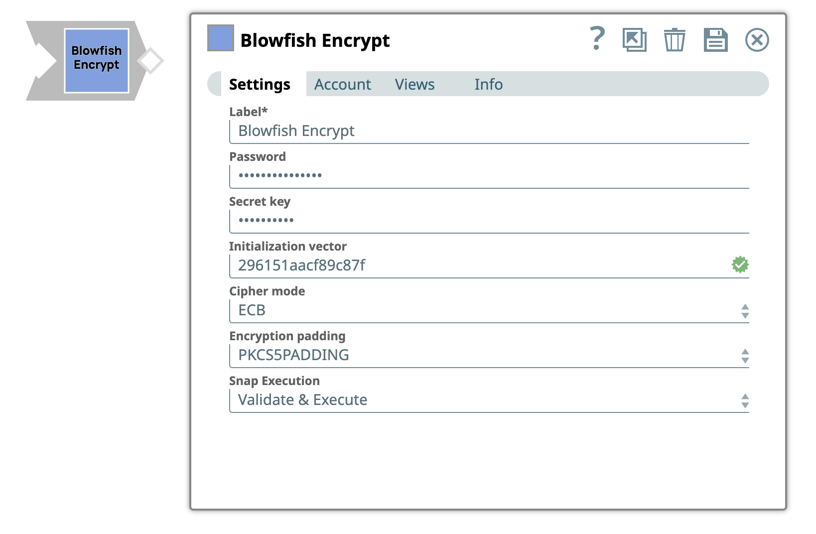 | Label | String | Required. Specify a unique name for the Snap. Modify this to be more appropriate, especially if more than one of the same Snaps is in the pipeline. Default value: Blowfish Encrypt Example: Blowfish Encrypt |