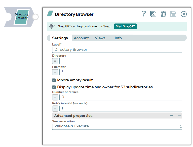 | Label | String | Required. Specify a unique name for the Snap. Modify this to be more appropriate, especially if more than one of the same Snaps is in the pipeline. Default value: Directory Browser Example: Directory Browser |