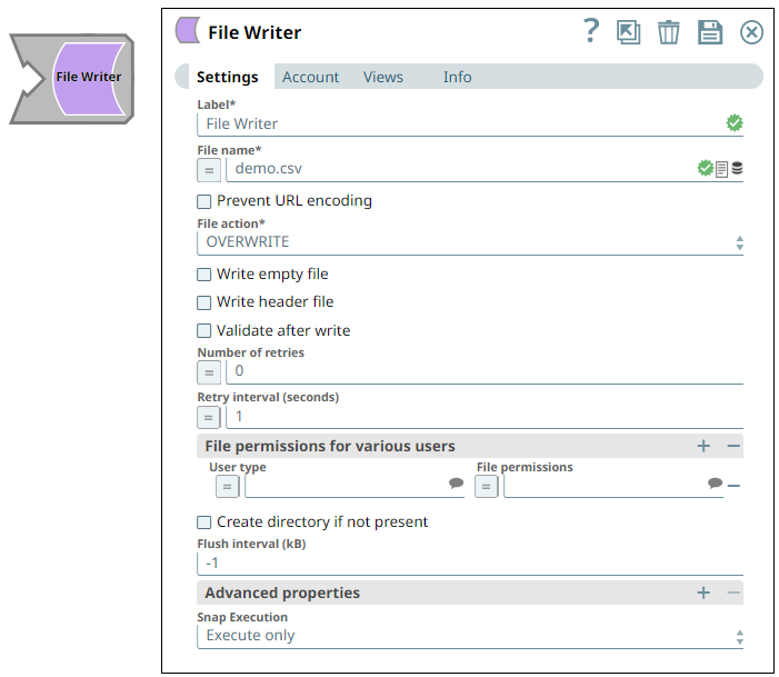 | Label | String | Required. Specify a unique name for the Snap. Modify this to be more appropriate, especially if more than one of the same Snaps is in the pipeline. Default value: File Writer Example: File Writer |