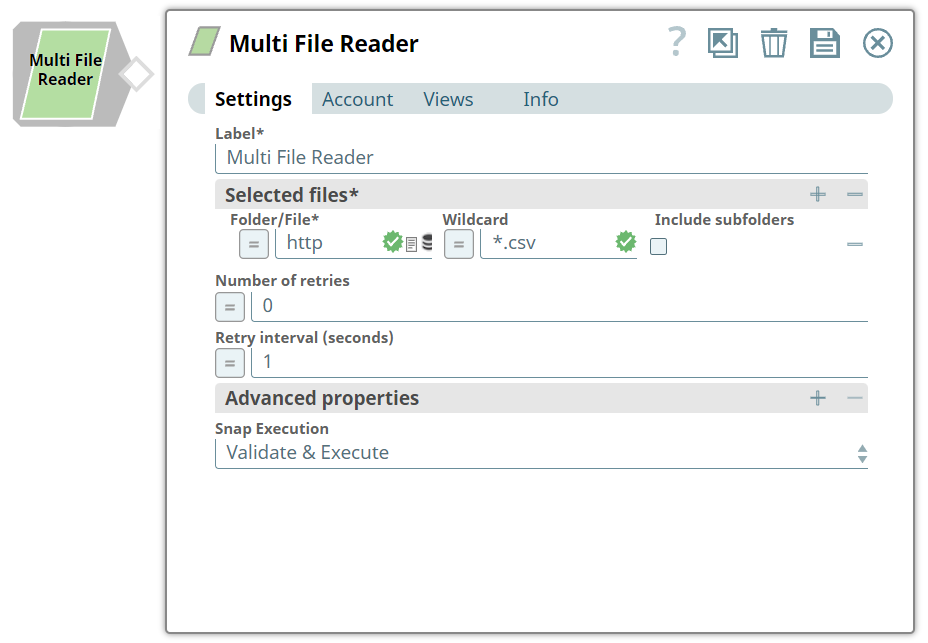 | Label | String | Required. Specify a unique name for the Snap. Modify this to be more appropriate, especially if more than one of the same Snaps is in the pipeline. Default value: Multi File Reader Example: Multi File Reader |