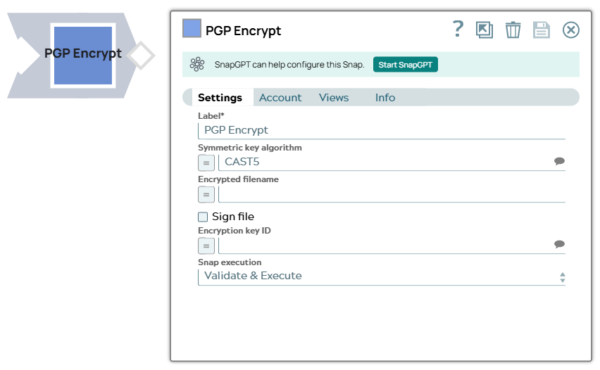 | Label | String | Required. Specify a unique name for the Snap. Modify this to be more appropriate, especially if more than one of the same Snaps is in the pipeline. Default value: PGP Encrypt Example: PGP Encrypt |