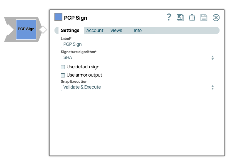 | Label | String | Required. Specify a unique name for the Snap. Modify this to be more appropriate, especially if more than one of the same Snaps is in the pipeline. Default value: PGP Sign Example: PGP Sign - MyDoc |