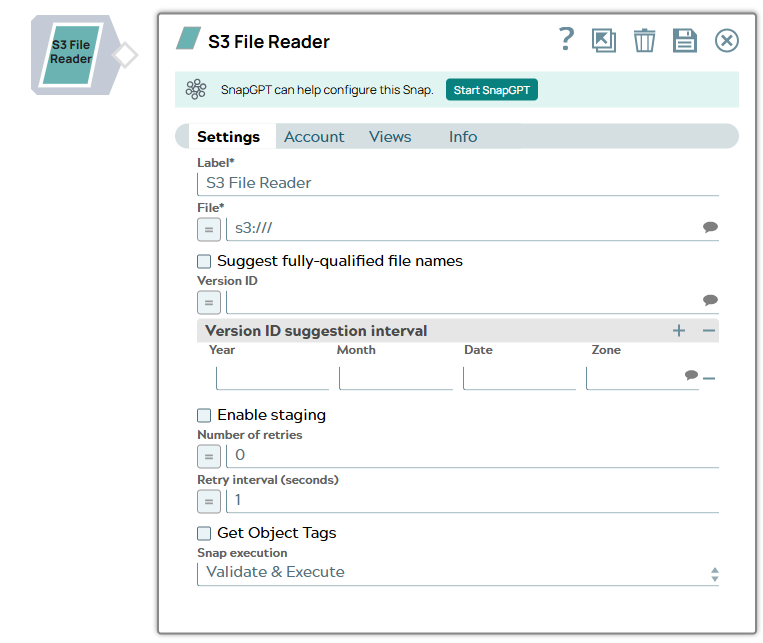 | Version ID | String/Expression/ Suggestion | Enter or select S3 file version ID. If the property is empty, the Snap reads
