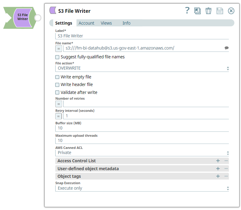 | Label | String | Required. Specify a unique name for the Snap. Modify this to be more appropriate, especially if more than one of the same Snaps is in the pipeline. Default value: S3 File Writer Example: S3 File Writer |