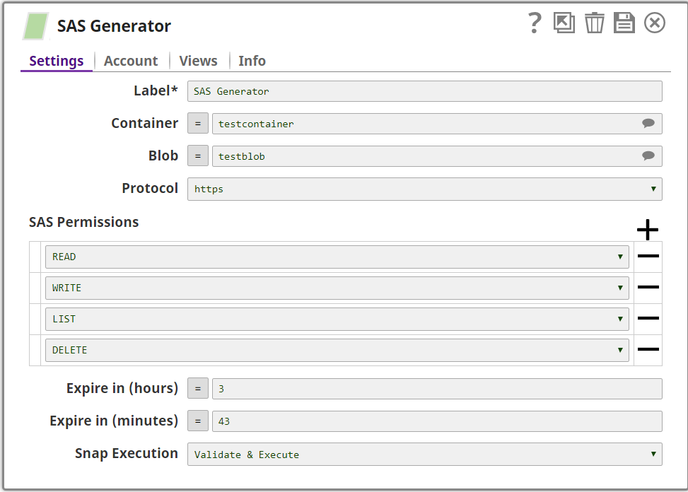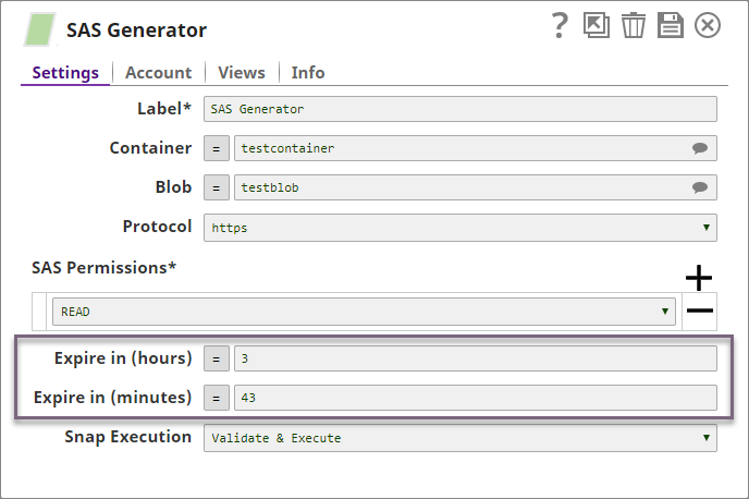 The validity of the SAS URI is determined by the values in the Expire in (hours) and Expire in (minutes) properties. For example, if the SAS Generator Snap is configured as shown below, the validity of the SAS URI generated by the Snap is 3 hours and 43 minutes.