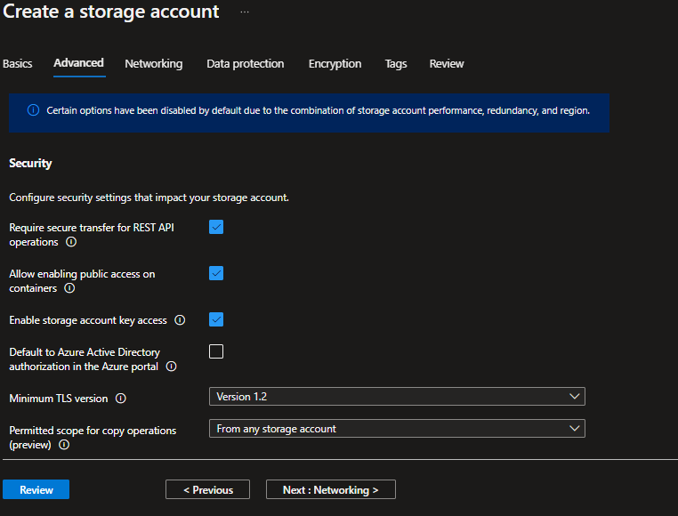 | Permitted scope for copy operations | Drop-down | When this property is enabled, the Azure portal authorizes requests to blobs, queues, and tables with Azure Active Directory by default. | |